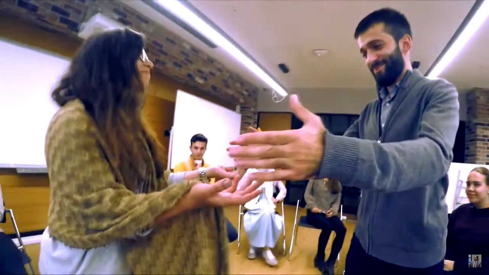 Everyone extends their hands into the circle and by intermingling their arms, grasps hands with other